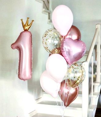 фонтан из 9 шаров ( 3 хром, 2 конфетти, сердечко, 3 розовых шарика)